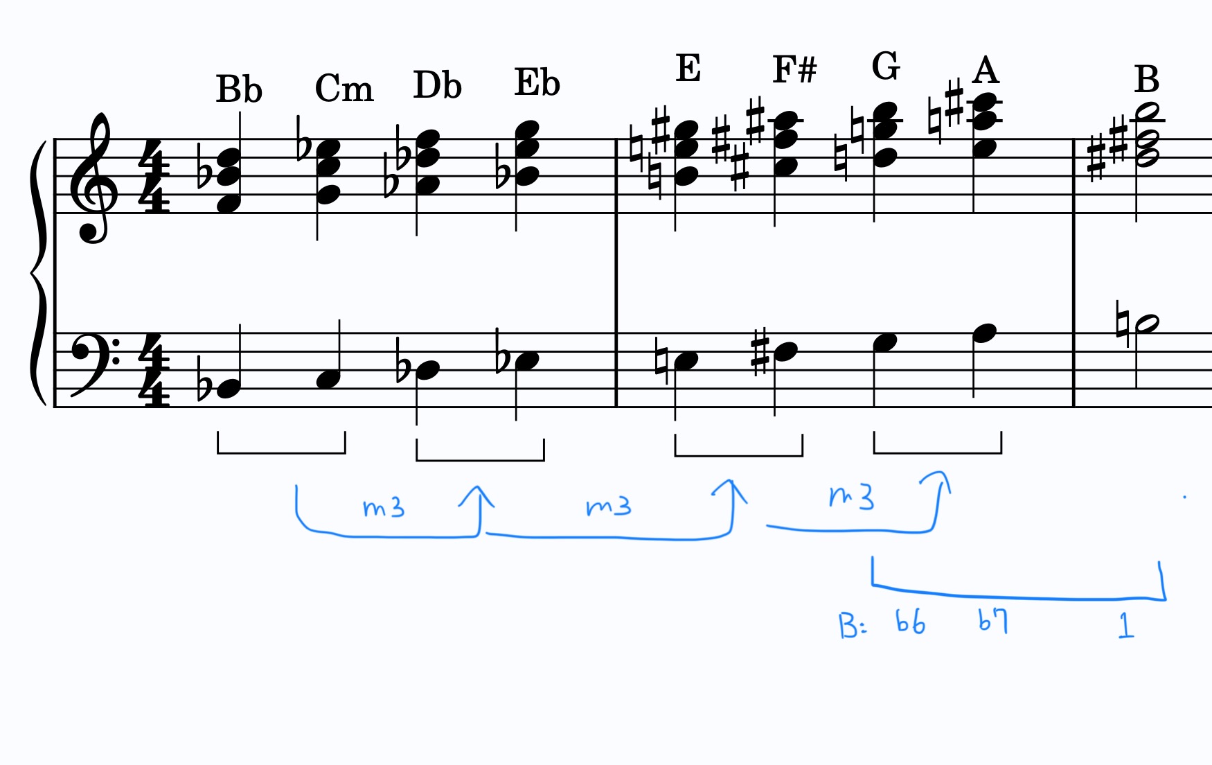 在小三度堆疊的同時,也附帶了轉調意圖。最後的 G-A-B 正是 B大調的 b6-b7-1。
