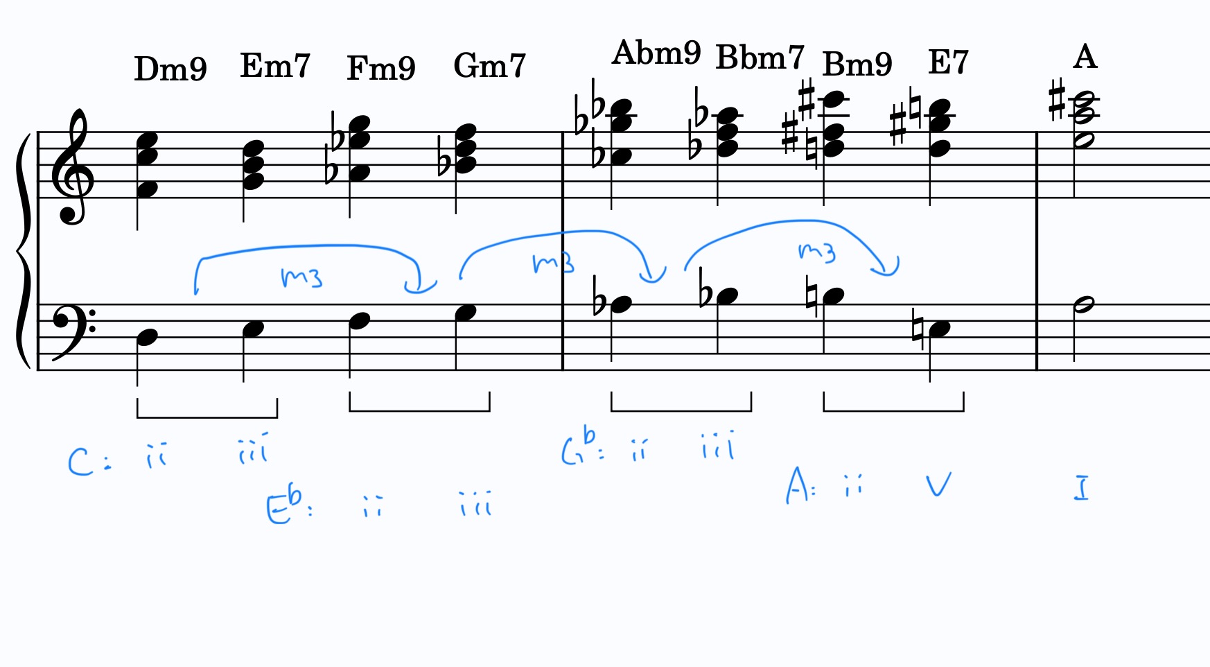 最後最特別的例子:這次的小結構不再是2-3或4-5的上行,而是4-3-2下行。我們從Eb大調4-3-2,往上小三度經過Gb大調4-3-2和A大調的4-3-2-5,再透過旋律上半音絲滑的進入Bb9sus,也是原調Eb大調的5級。 在小三度上行結構中,旋律都是和弦的7度音,所以就形成一種平行移動(方向都向下)的感覺。