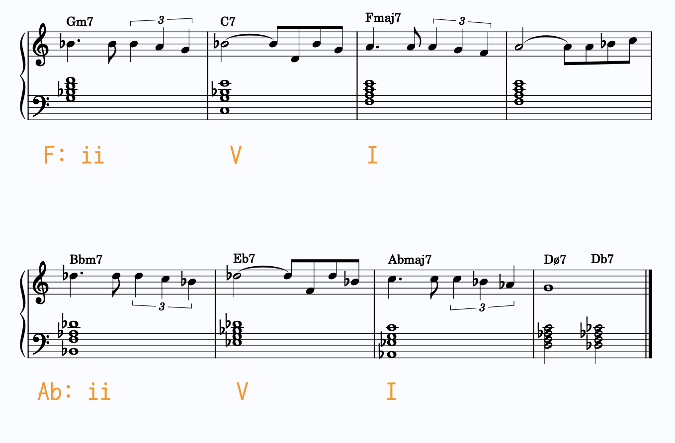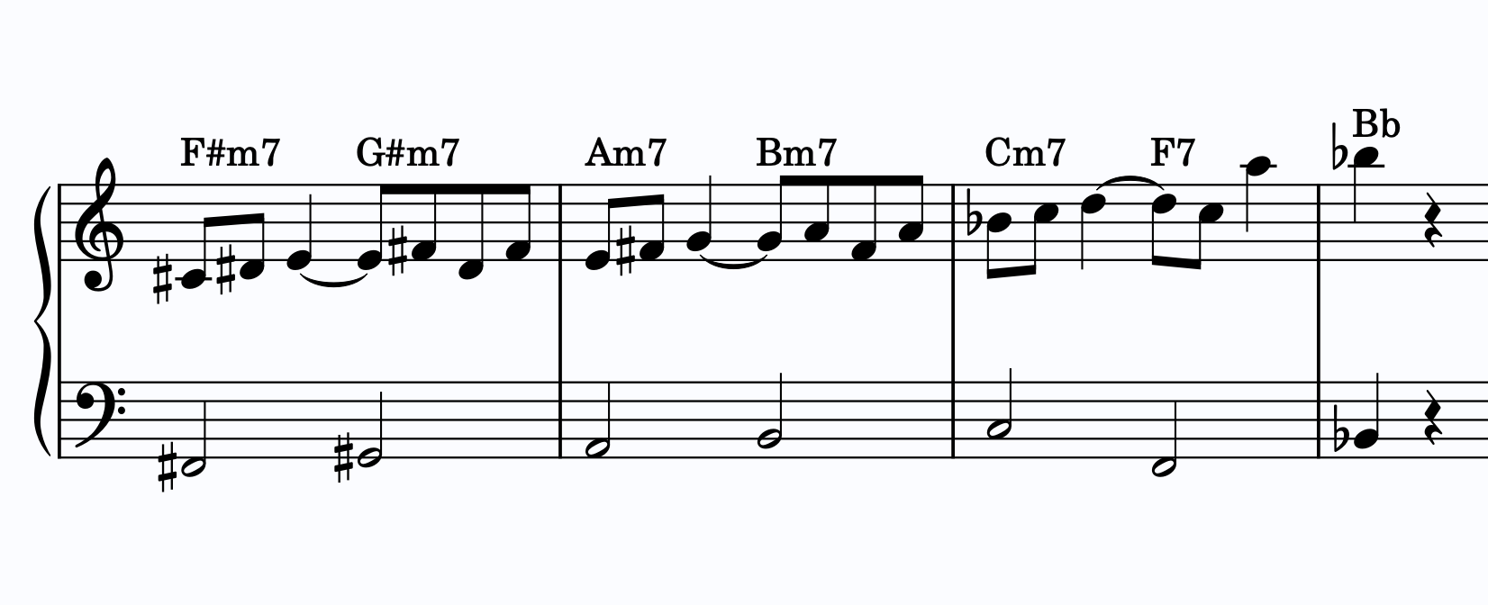 ii-iii-iv-bVII-I。可以說是上面「動機」那一塊的變體,融合了451和b6-b7-1。記得iv-bVII-I也稱為「backdoor 251」,在251家族中有提及!